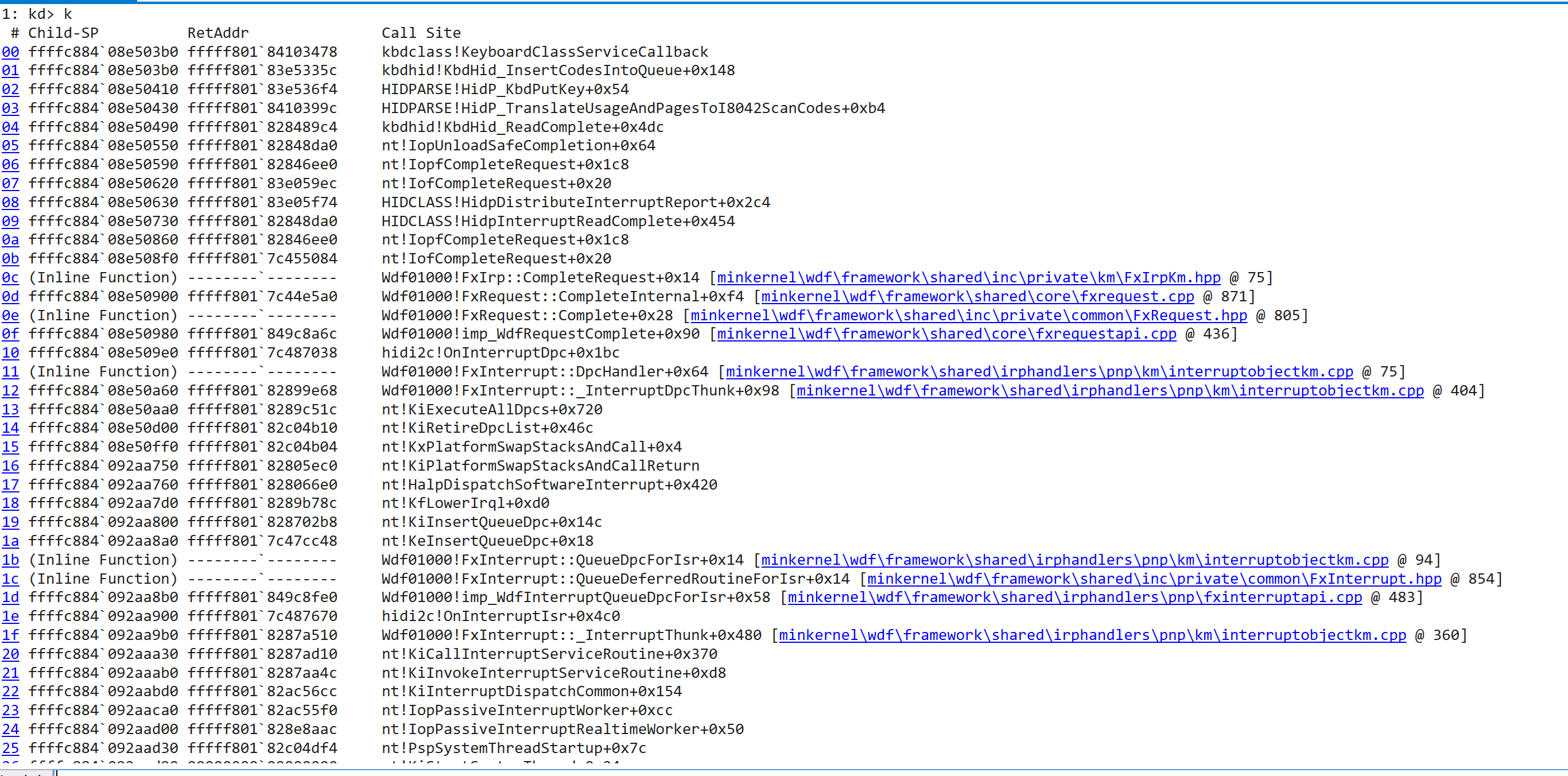 一个键盘按(I2CHID,而不是USB-HID,除了从USBHUB哪里开始,其他hidclass等逻辑是一样的)下的调用栈(Windows on arm):